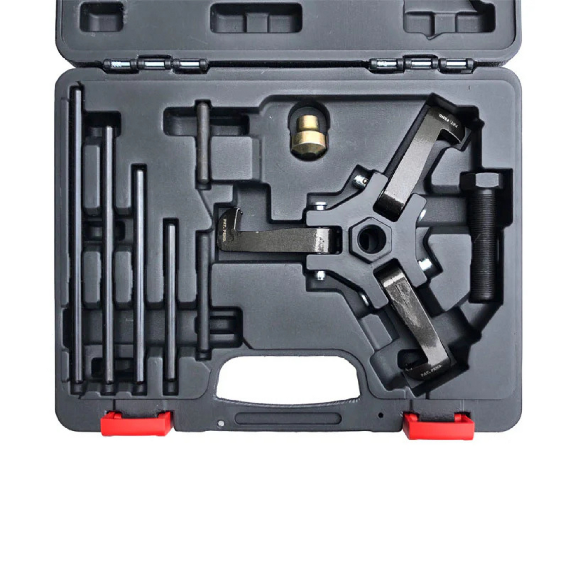 The Schley Low-Profile Harmonic Damper Pulley Puller is a compact, spring-loaded tool designed for quick and efficient removal of harmonic damper pulleys on a variety of modern engines. Compatible with 2018+ Ford® Coyote engines, GM®/Chevrolet® LS V8s, and other vehicles using 3- or 6-spoke pulleys like the 3.0L Duratec, this puller features patent-pending low-profile legs that grip the backside of narrow pulley spokes for a secure and effective pull. Its unique design increases grip as pressure is applied, making it the ideal tool for tight engine bays.