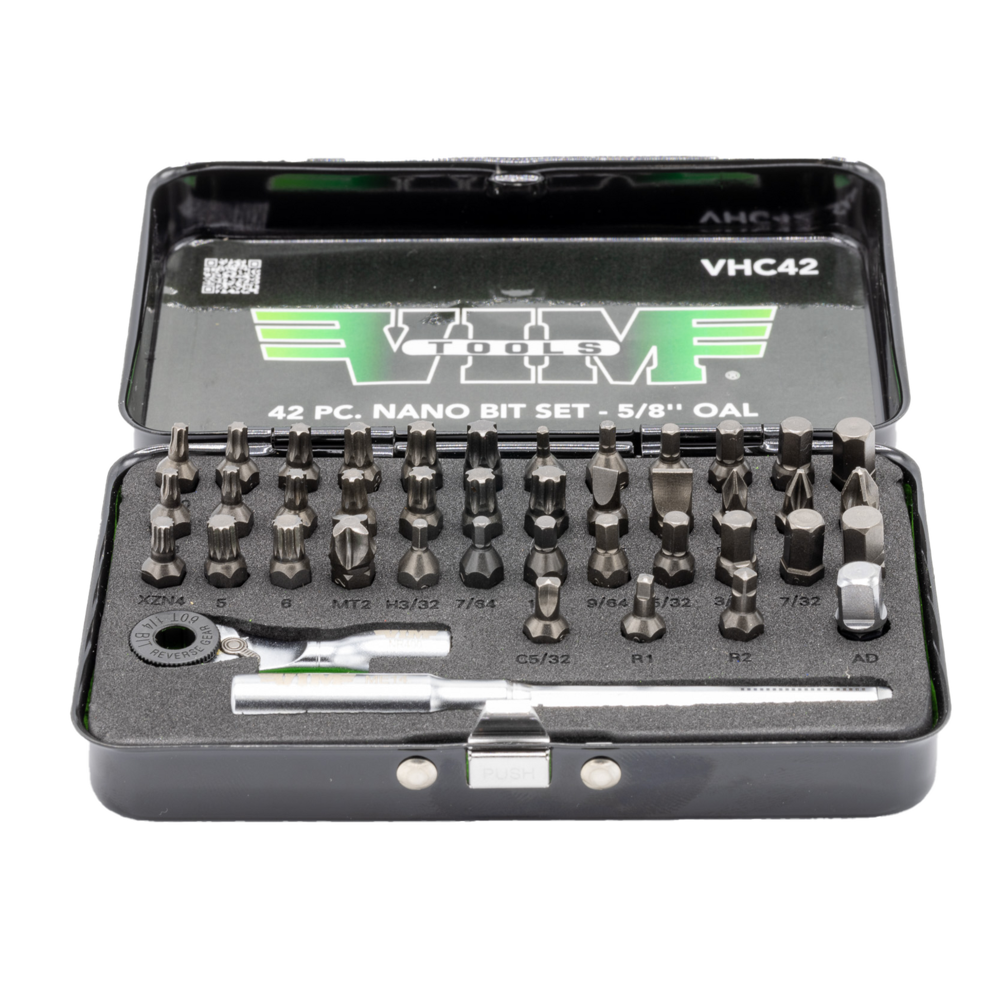The 42 PC. Nano Bit Set is a compact and versatile toolset designed for precision work in tight spaces. With an ultra-short 5/8" overall length (OAL), these nano bits provide maximum accessibility for hard-to-reach fasteners. Perfect for mechanics, technicians, and DIY enthusiasts, this set comes in a durable metal case for easy organization and transport.