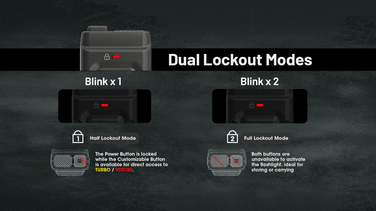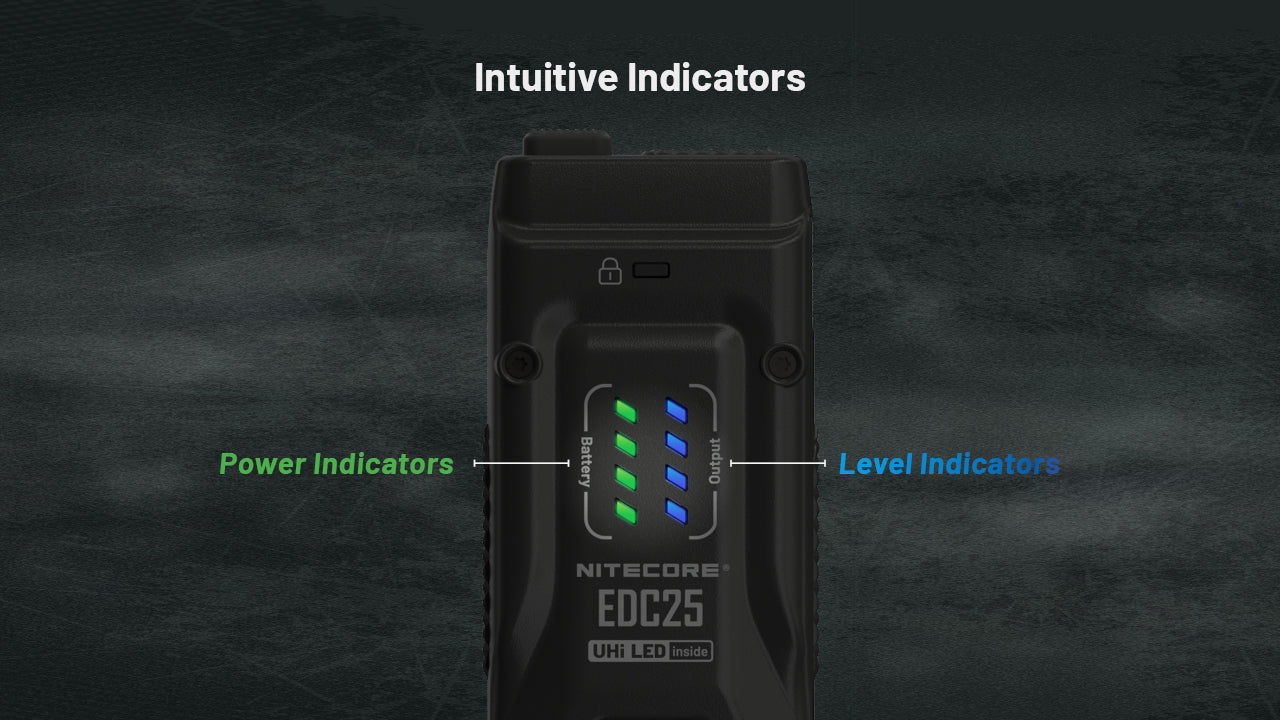 The EDC25 is designed for simple, reliable use. Fully press the Power Button to turn the light on or off, or half-press while on to cycle through four brightness levels, shown on the level indicators. The flashlight memorizes the last brightness setting for convenience when reactivated. For quick access, half-press the Power Button while off to enter Ultralow mode. A customizable button lets you set Turbo or Strobe for instant use. To configure, press and hold the customizable button, then fully press the Power Button without releasing to switch between modes. Once set, pressing the customizable button will quickly activate your preferred output.