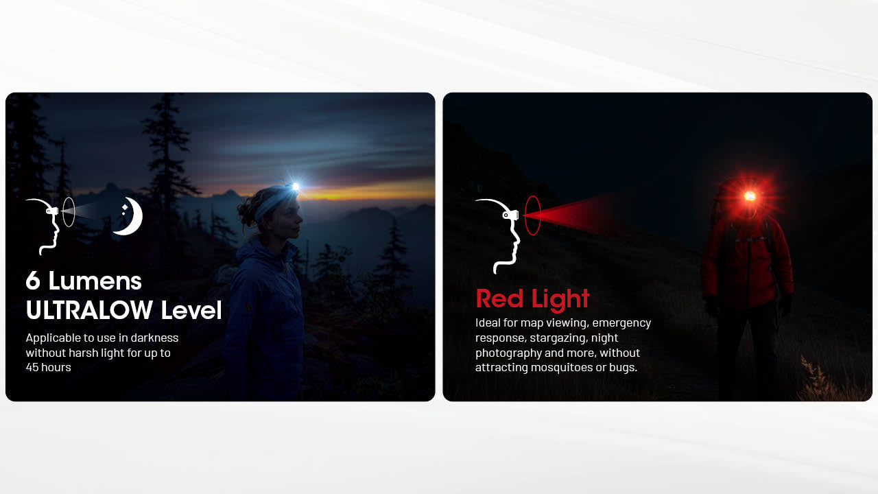 The Nitecore NU25 MCT UL rechargeable headlamp is the ideal companion for various activities such as camping, hiking, trail running, and more. Its ultra-high efficiency (UHE) LEDs are able to emit a bright 400 lumen beam that can reach distances of up to 144 yards. With its new Multiple Color Temperature (MCT) LEDs, the NU25 MCT UL lets you switch between warm, neutral, and cool light, which maximizes your visibility and comfort no matter the weather, terrain, or lighting condition. Warm Light (3000K) is easier on your eyes and is able to cut through fog and rain. Neutral White (4500K) offers a clear and natural light for various day-to-day activities while Cool White (6500K) is for enhanced visibility in outdoor environments. The NU25 MCT UL offers remarkable versatility with up to four different brightness levels that are able to shine in whatever color temperature you choose. Alternatively, switch to the Red Light mode to protect your night vision or use it as a long-lasting signal light with three red modes: Low, High, and Slow Flashing. The NU25 MCT UL also features modes like SOS and Beacon to assist you in any emergency.