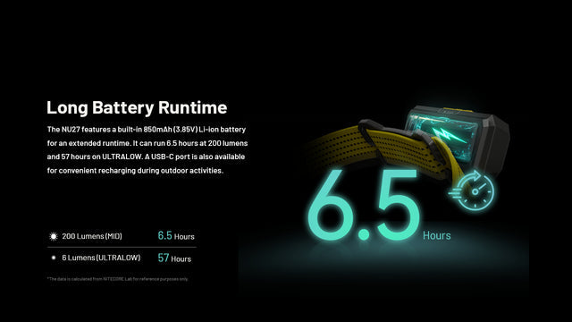 At just 1.98 oz, the NU27 is lightweight and comfortable for extended wear. Its 850mAh rechargeable battery provides up to 57 hours of runtime and recharges quickly via USB-C in just over an hour. A power indicator shows battery status, and lockout mode prevents accidental activation.