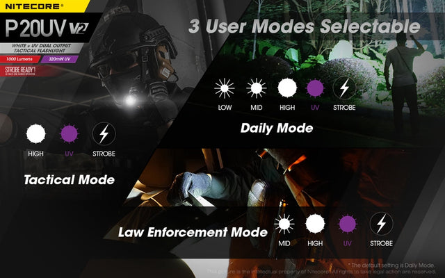 Designed for military, police and security personnel, the P20UV v2 always allows direct access to turbo and strobe mode. The light can be customized with three operating modes: tactical mode, law enforcement mode, and daily mode for different usage scenarios.