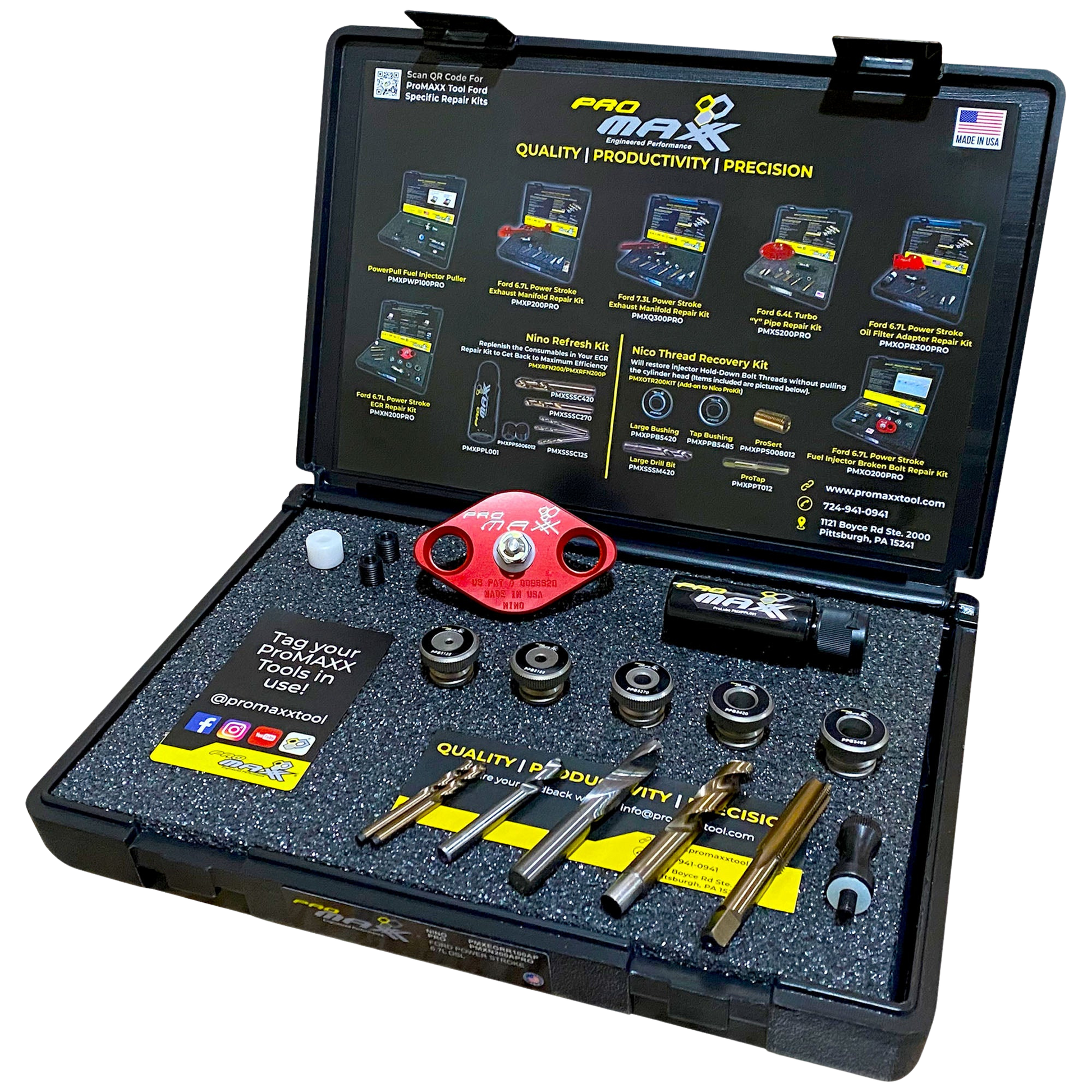 The ProMAXX Tool Nino 6mm Kit is a fast, efficient solution for repairing broken 8mm EGR tube mounting bolts without extensive disassembly, saving time and ensuring precision. The 8mm Powerstroke 6.7L EGR Tube version is designed for engines from 2011 – 2020. The Ford part number is W714852-S900.