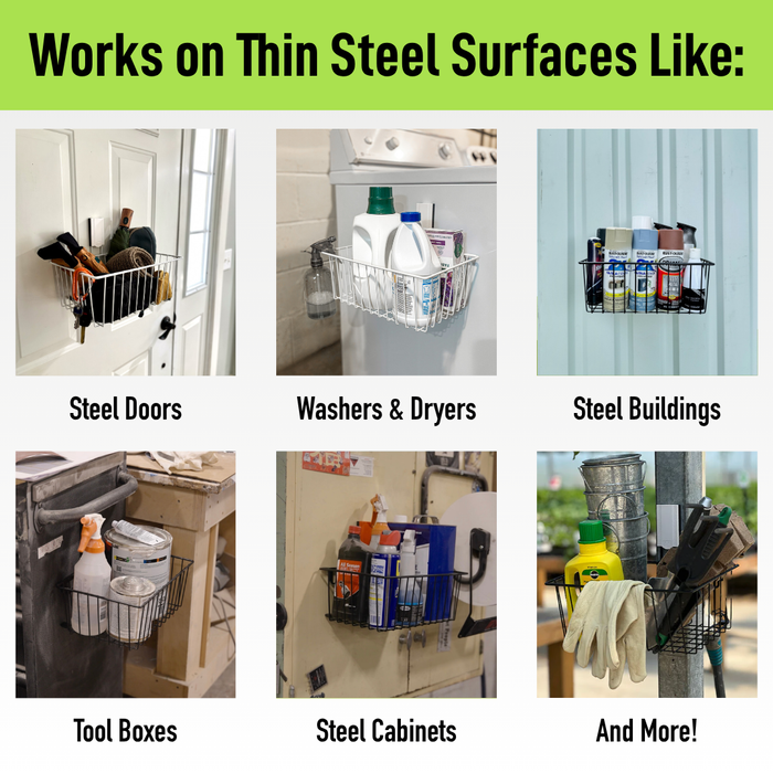 Declutter and organize your garage, workshop, work van, or shed with the Gator Magnetics Small Utility Basket. Engineered for serious strength and all-around versatility, this heavy-duty magnetic basket locks securely onto compatible thin steel vertical surfaces and holds tight with up to 35 pounds of shear strength. Whether you're organizing tools or freeing up floor space, this basket works as hard as you do. Install in seconds: lift the lever, place the basket, close the lever, and load it up. Need to move it? No problem. Our patented “Easy-Off” mechanism lets you reposition it quickly without hassle. No scratches. No dents. No residue. Just clean removal every time.